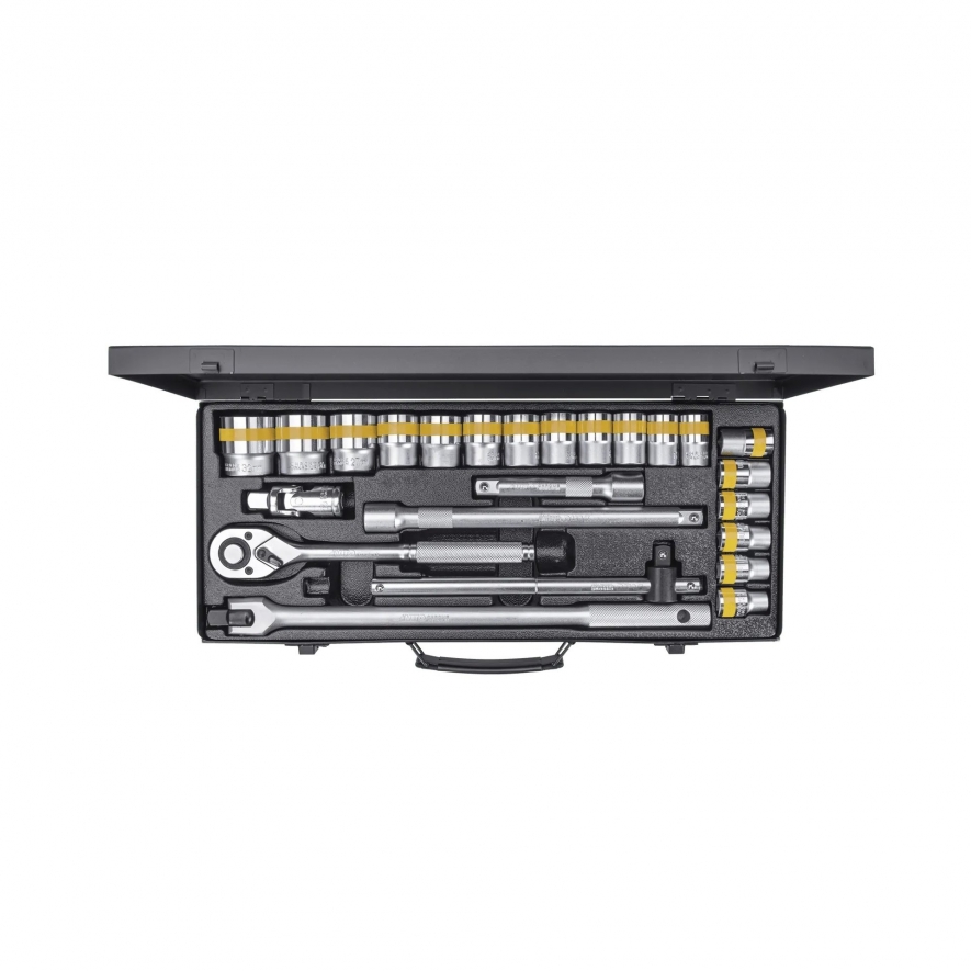 Conjunto de Chaves de Roquete com 24 peças, 19 chaves, 2 extensões, 1 barra deslizante, 1 chave de aperto, 1 chave cardan articulada.